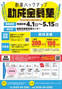 ※過去に創業バックアップ助成金、函館市チャレンジ補助金、北斗市起業化支援補助金の認定を受けた方は応募できません。